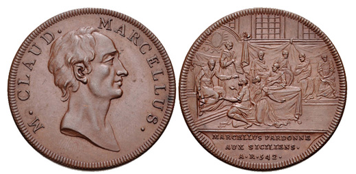 The Peale Museum's medal commemorating M. Claudius Marcellus (ca. 268-208 BCE) may have been like the one pictured here, by Jean Dassier & sons, 1740-1750, depicting the head of Marcellus (obverse) and Marcellus forgiving the Sicilians (reverse).