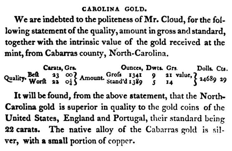 Poulson's American Daily Advertiser (Philadelphia), 6 Oct 1808 reads: "Native Gold, from Cabarus county, North Carolina, pure Gold, pure Silver, and pure Platinum, Palladium, obtained from Gold by the donor -- presented by Mr. Joseph Cloud."