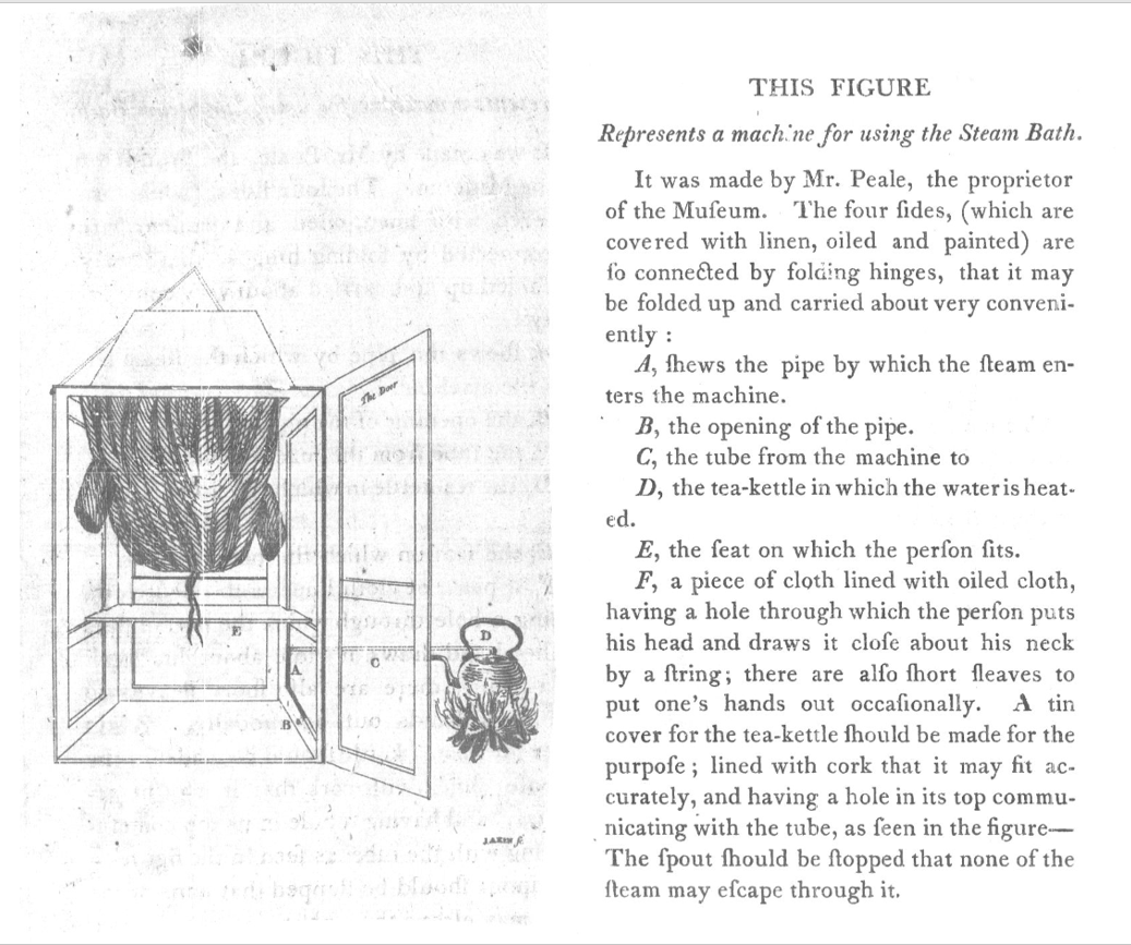 Following the 53-page pamphlet is a page describing Peale's design of a steam bath machine and an engraved illustration of it, pictured here.