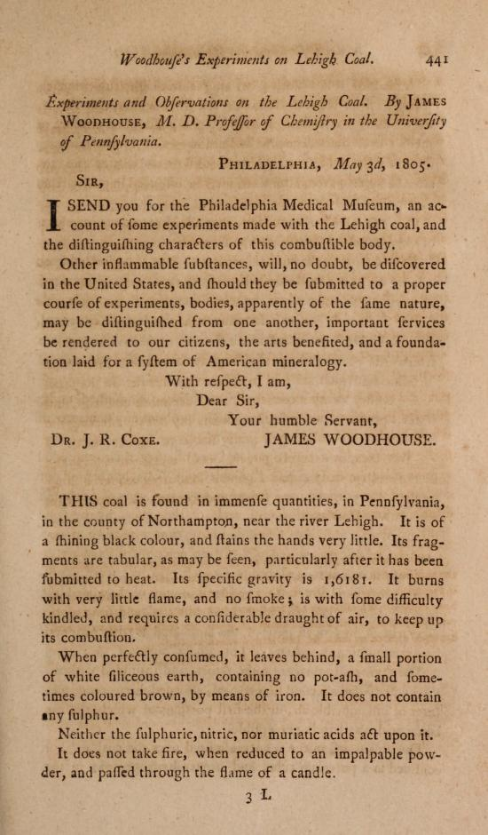 James Woodhouse (1770-1809), "Experiments and Observations on the Lehigh Coal," Coxe's Medical Museum, 1 (1805): 441-444.