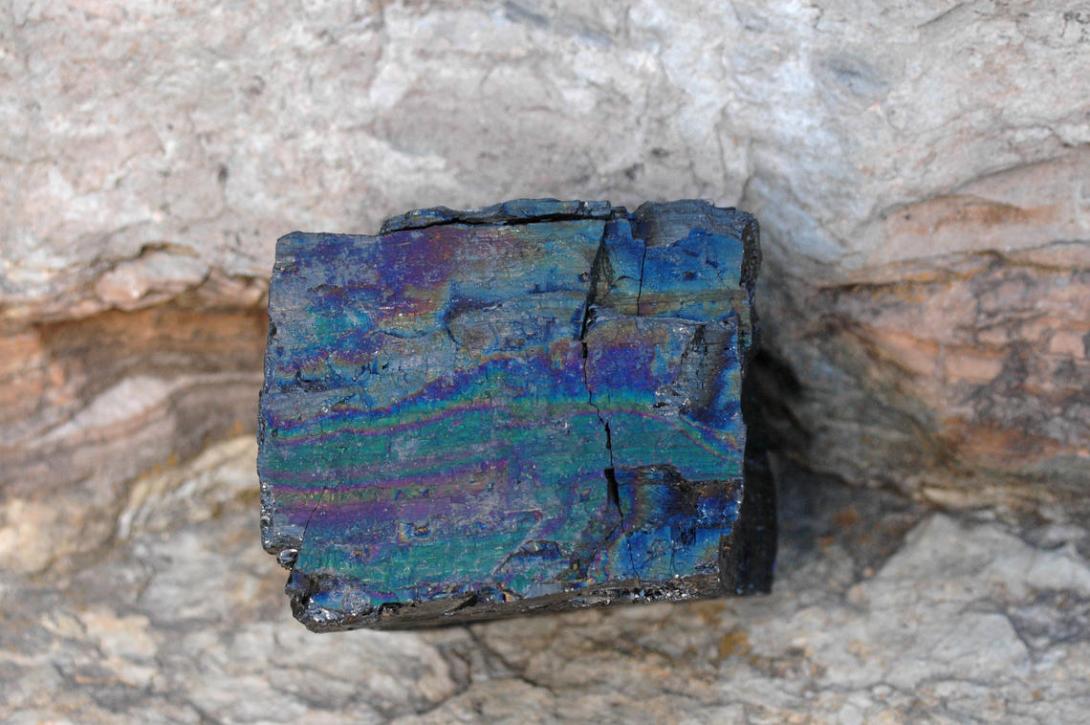Iridescent coal is sometimes known as peacock coal. "Peacock coal is not a specific class of coal, but rather the name for an effect in which oxidizing materials in the coal create a dazzling array of colors on the surface of the coal. Usually it is short-lived, as the material fully oxidizes away shortly after exposed to air." USGS / https://www.usgs.gov/media/images/peacock-coal