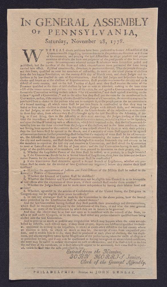 In General Assembly of Pennsylvania, Saturday, November 28, 1778: Whereas divers petitions have been presented to former Assemblies of this commonwealth suggesting inconveniences in the present constitution and form of government ... /Extract from the minutes, John Morris Junior, clerk of the General Assembly