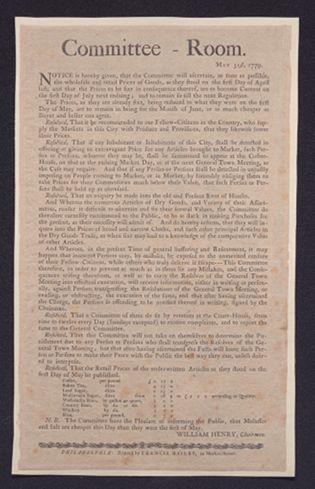 Committee-room. May 31st, 1779: Notice is hereby given, that the committee will ascertain, as soon as possible, the wholesale and retail prices of goods, as they stood on the first day of April last, and that the prices to be fixt in consequence thereof, are to become current on the first day of July next ensuing ... /William Henry, chairman