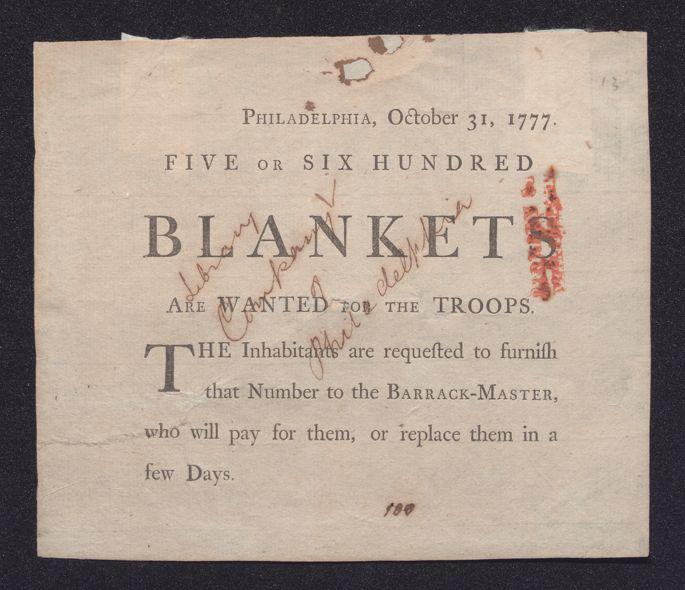 Philadelphia, October 31, 1777: Five or six hundred blankets are wanted for the troops. The inhabitants are requested to furnish that number to the barrack-master, who will pay for them, or replace them in a few days