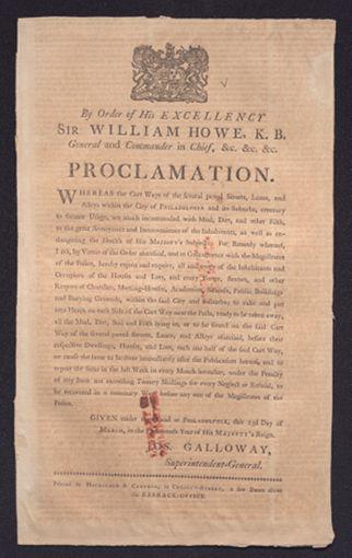 By order of His Excellency Sir William Howe, K.B. general and commander in chief, &c. &c. &c. Proclamation: Whereas the cart ways of the several paved streets, lanes, and alleys within the city of Philadelphia and its suburbs, contrary to former usage, are much incommoded with mud, dirt and other filth, to the great annoyance and inconvenience of the inhabitants ... /Given under my hand at Philadelphia, this 23d day of March, in the eighteenth year of His Majesty's reign. Jos. Galloway, superintendent-general
