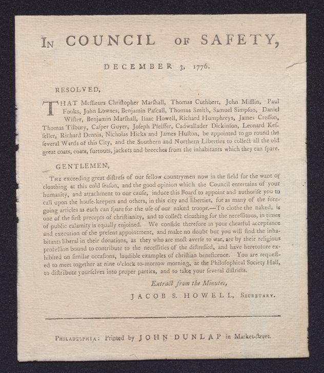 In Council of Safety, December 3, 1776: Resolved, that Messieurs Christopher Marshall, Thomas Cuthbett, John Mifflin, Paul Fooks, John Lownes, Benjamin Pascall, Thomas Smith, Samuel Simpson, Daniel Wister, Benjamin Marshall, Isaac Howell, Richard Humphreys, James Cresson, Thomas Tilbury, Casper Guyer, Joseph Pfeiffer, Cadwallader Dickinson, Leonard Kesseller, Richard Dennis, Nicholas Hicks and James Huston, be appointed to go round the several wards of this city, and the Southern and Northern Liberties to collect all the old great coats, coats, surtouts, jackets and breeches from the inhabitants which they can spare. ..