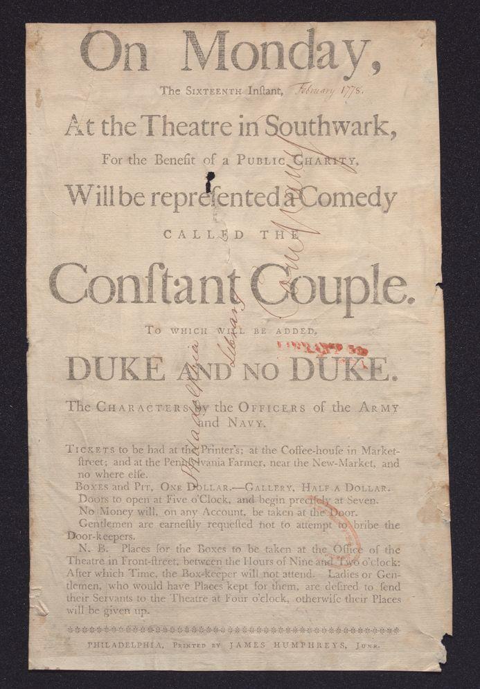 On Monday, the sixteenth instant, at the theatre in Southwark, for the benefit of a public charity, will be represented a comedy called The constant couple. To which will be added, Duke and no duke. The characters by the officers of the Army and Navy
