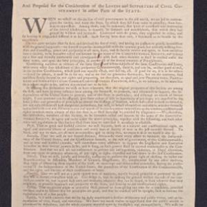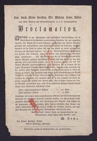 Eine durch Seine Excellenz, Sir William Howe, Ritter vom Bad, General und Oberbefehlhaber, &c. &c. &c. herausgegeben Proclamation: Sintemal es zur schleunigern und würklichern Unterdrückung der in Nord-America herrschenden unnatürlichen Rebellion für gut angesehen worden, eine Anzahl Provinzial Truppen anzuwerben ... Gebeben unter meiner Hand, im Haupt-Quartier zu Germantown, diesen achten Tag October, 1777. W. Howe. Auf Seiner Excellenz Befehl, Robert Mackenzie, Secretär