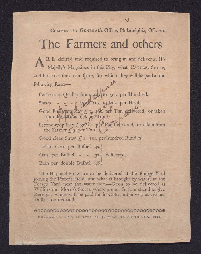 Commissary General's Office, Philadelphia, Oct. 10: The farmers and others are desired and required to bring in and deliver at His Majesty's magazines in this city, what cattle, sheep, and forage they can spare, for which they will be paid at the following rates-- ..