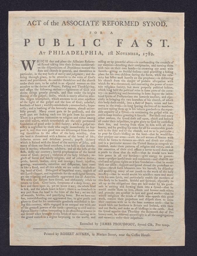 Act of the Associate Reformed Synod, for a public fast: At Philadelphia, 1st November, 1782