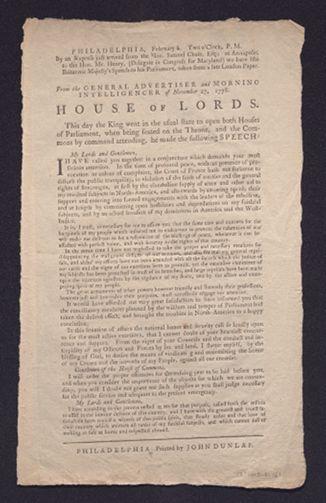 Philadelphia, February 6. Two o'clock P.M: By an express just arrived from the Hon. Samuel Chase, Esq; at Annapolis, to the Hon. Mr. Henry, (delegate in Congress for Maryland) we have His Britannic Majesty's speech to his Parliament, taken from a late London paper. From the General advertiser and morning intelligencer of November 27, 1778. House of Lords. This day the King went in the usual state to open both Houses of Parliament, when being seated on the throne, and the Commons by command attending, he made the following speech: ..