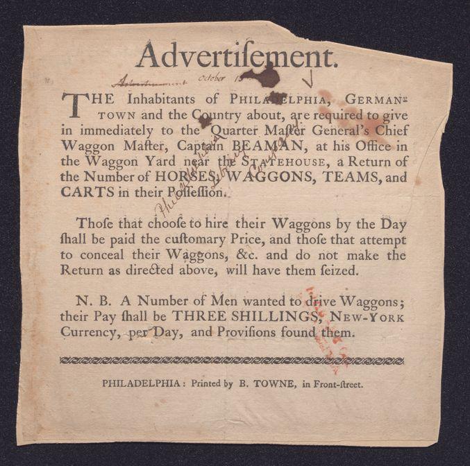 Advertisement. The inhabitants of Philadelphia, Germantown, and the country about, are required to give in immediately to the quarter master general's chief waggon master, Captain Beaman, at his office in the waggon yard near the statehouse, a return of the number of horses, waggons, teams, and carts in their possession: Those that choose to hire their waggons by the day shall be paid the customery price, and those that attempt to conceal their waggons, &c. and do not make the return as directed above, will have them seized. N.B. A number of men wanted to drive waggons; their pay shall be three shillings, New-York currency, per day, and provisions found them