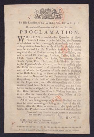 By His Excellency Sir William Howe, K.B. general and commander in chief, &c. &c. &c. Proclamation.Whereas a considerable quantity of naval stores is known to be in this city, the property of which has not been thoroughly ascertained; and whereas importations have been made of sundry articles which may be wanted for His Majesty's service; it is hereby required, that all persons having in their possession, and not in actual use, cordage, anchors, cables, sails, ... /Given under my hend at head-quarters in Philadelphia, the 12th day of January, 1778. W. Howe. By His Excellency's command, Robert Mackenzie, secretary