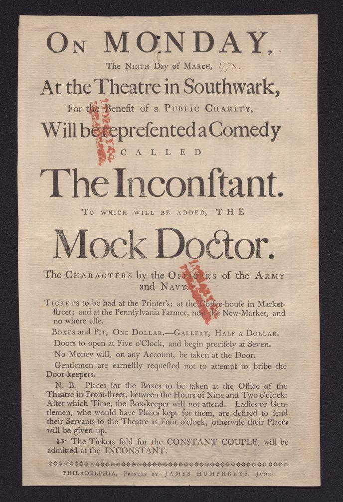 On Monday, the ninth day of March, at the theatre in Southwark, for the benefit of a public charity, will be represented a comedy called The inconstant. To which will be added, The mock doctor. The characters by the officers of the Army and Navy. ...