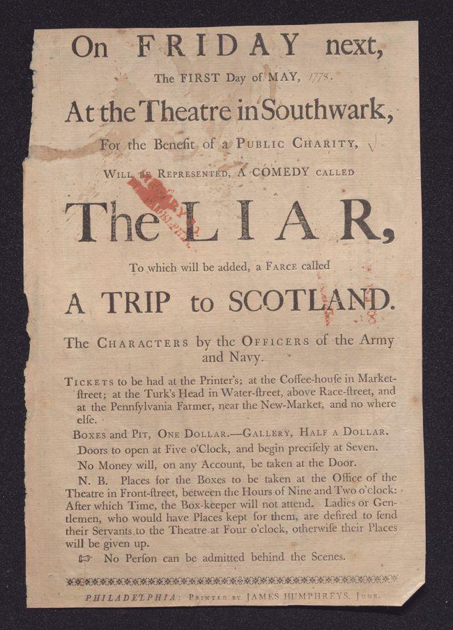 On Friday next, the first day of May, at the theatre in Southwark, for the benefit of a public charity, will be represented, a comedy called The liar, to which will be added, a farce called A trip to Scotland. The characters by the officers of the Army and Navy. ...