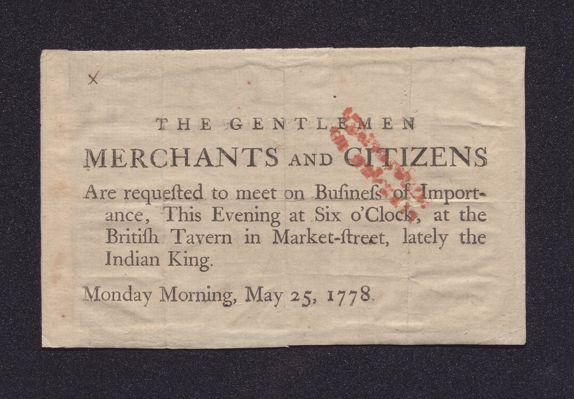 The Gentlemen merchants and citizens are requested to meet on business of importance, this evening at six o'clock, at the British Tavern in Market-street, lately the Indian King. Monday morning, May 25, 1778