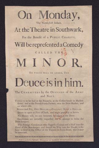 On Monday, the twenty-sixth instant, at the theatre in Southwark, for the benefit of a public charity, will be represented a comedy called The minor, to which will be added, The deuce is in him. The characters by the officers of the Army and Navy.