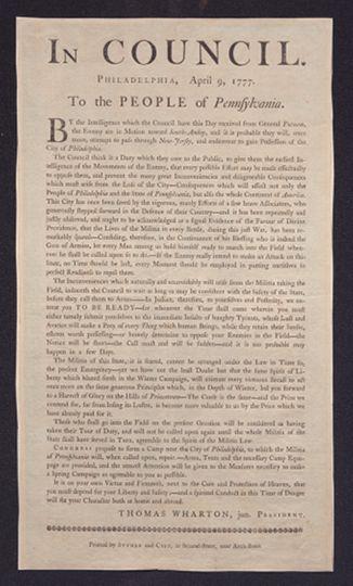 In Council. Philadelphia, April 9, 1777. To the people of Pennsylvania: By the intelligence which the Council have this day received from General Putnam, the enemy are in motion toward South-Amboy, and it is probable they will, once more, attempt to pass through New-Jersey, and endeavour to gain possession of the city of Philadelphia. ... /Thomas Wharton, jun. president.