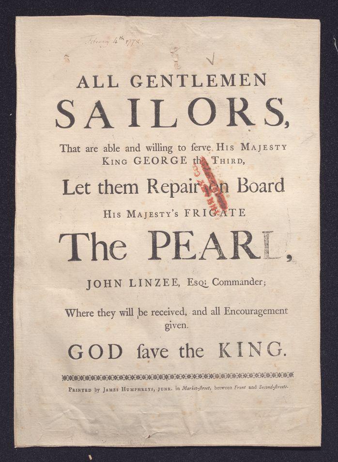 All gentlemen sailors, that are able and willing to serve His Majesty King George the Third, let them repair on board His Majesty's frigate the Pearl, John Linzee, Esq; commander; where they will be received, and all encouragement given: God save the King.