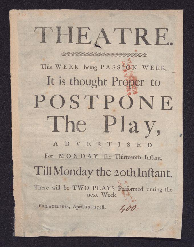 Theatre. This week being Passion Week, it is thought proper to postpone the play, advertised for Monday the thirteenth instant, till Monday the 20th instant. There will be two plays performed during the next week.
