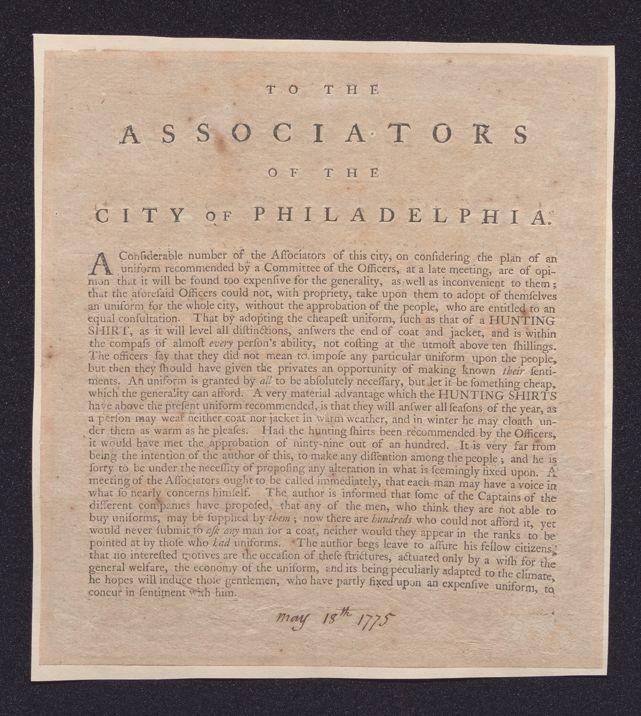 To the associators of the city of Philadelphia. A considerable number of the associators of this city, on considering the plan of an uniform recommended by a committee of the officers ... could not, with propriety, take upon them to adopt of themselves an uniform for the whole city, without the approbation of the people ..