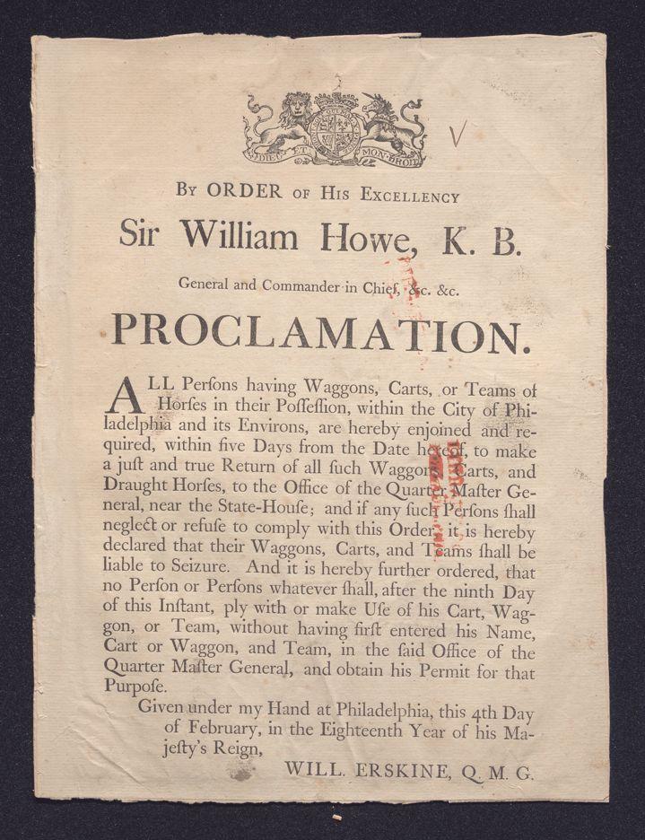 By order of His Excellency Sir William Howe, K.B. general and commander in chief, &c. &c. Proclamation: All persons having waggons, carts, or teams of horses in their possession, within the city of Philadelphia and its environs, are hereby enjoined and required, within five days from the date hereof, to make a just and true return of all such waggons, carts, and draught horses, to the office of the quarter master general, near the State-House; and if any such person shall neglect or refuse to comply with this order, it is hereby declared that their waggons, carts, and teams shall be liable to seizure. And it is hereby further ordered, that no person or persons whatever shall, after the ninth day of this instant, ply with or make use of his cart, waggon, or team, without having first entered his name, cart or waggon, and team, in the said office of the quarter master general, and obtain his permit for that purpose. /Given under my hand at Philadelphia, this 4th day of February, in the eighteenth year of his Majesty's reign, Will. Erskine, Q.M.G