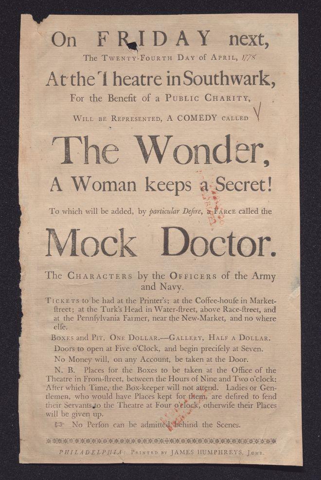 On Friday next, the twenty-fourth day of April, at the theatre in Southwark, for the benefit of a public charity, will be represented, a comedy called The wonder, a woman keeps a secret! To which will be added, by particular desire, a farce called The mock doctor. The characters by the officers of the Army and Navy. ..