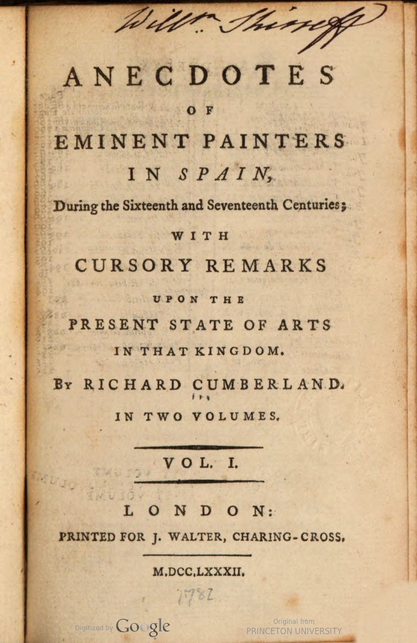 Richard Cumberland (1732-1811), Anecdotes of Eminent Painters in Spain, During the Sixteenth and Seventeenth Centuries: With Cursory Remarks upon the Present State of Arts in That Kingdom, 2 vols. (London, 1782)