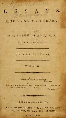 Vicesimus Knox (1752-1821), Essays Moral and Literary, 2 vols. (London, 1778-1779); pictured here is a two-volume 1792 Philadelphia edition.