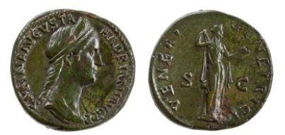 This sestertius minted in Rome may have been similar to the one pictured here: Obverse: SABINA AVGVSTA HADRIANI AVG P P (The empress Sabina, of the emperor Hadrian, Pater Patriae or Father of the country): Bust of Sabina, diademed, wearing stephane with hair in bun, draped, right / VENERI GENETRICI (Venus, progenator of the family) // S C (in field): Venus standing right, arranging drapery and holding apple. R.A. Abdy and P.F. Mittag, The Roman Imperial Coinage, vol. 2, part 3 (rev.), Hadrian, 2596-2598