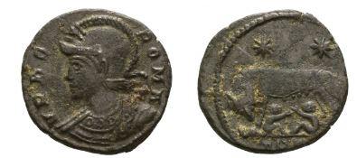 This coin (an AE3, silvered bronze) may have been similar to the one pictured here: Obverse: VRBS - ROMA (the city of Rome): Bust of Roma, visored with crested helmet, wearing ornamental mantle, left; Reverse: Wolf, standing left, suckling Romulus and Remus; above, two stars