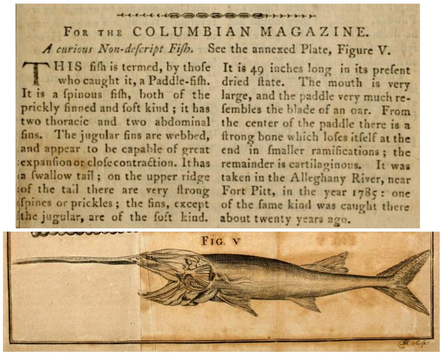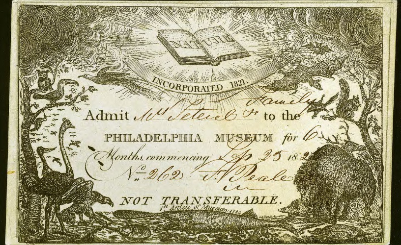 The paddlefish was the first object in the Peale Museum, other than the portraits. Charles Willson Peale described its acquisition: "Mentioning to Mr Robert Patterson, the idea that had been suggested to me, of adding natural curiosities to my picture gallery, he much approved the plan, and said he had an article which was considered interesting; a fish found in the Allegany river, near Pittsburgh, called a paddle-fish; the like had not been known for many years. To this fish is attached the donor's name, and the date of the commencement of the museum, 1785." The paddlefish was featured on the Museum's printed admission ticket (bottom center, pictured here) and in the painting "The Artist in His Museum." Charles Willson Peale, "Address to the Corporation and Citizens of Philadelphia," 18 July 1816; Selected Papers, 3: 413