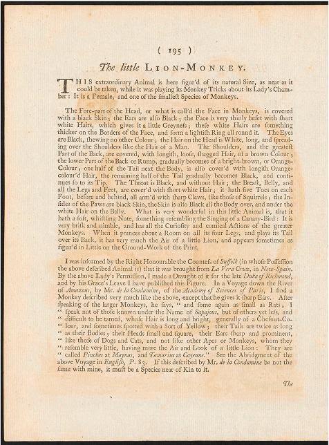 "It is the smallest species of the Monkey, being no bigger than a large rat. What is wonderful in this little animal is that it hath a soft whistling note, something resembling the singing of a Canary bird."