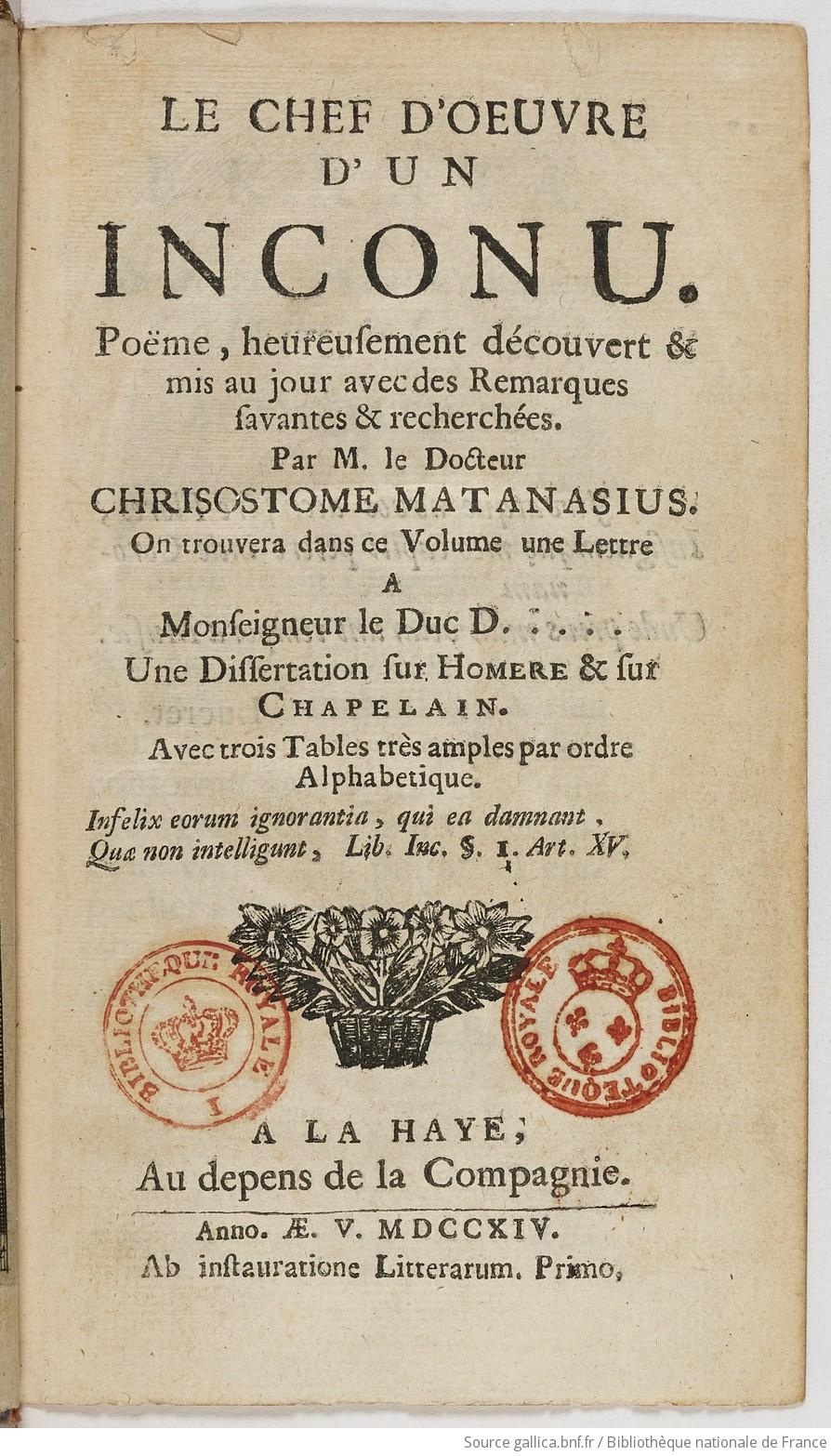 Le chef d'oeuvre d'un inconu [i.e., inconnu]: poème heureusement découvert & mis au jour, avec des remarques savantes et recherchées