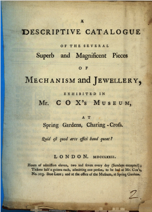 A Descriptive Catalogue of the Several Superb and Magnificent Pieces of Mechanism and Jewellery: Exhibited in Mr. Cox's Museum, at Spring Gardens, Charing-Cross