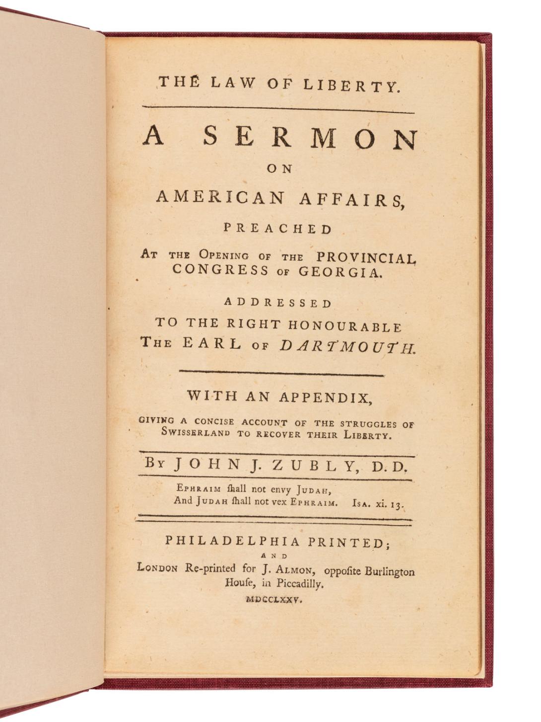 Zubly had published five sermons by 1775. One that would have particularly appealed to Du Simitière -- The law of liberty. A sermon on American affairs, preached at the opening of the provincial congress of Georgia (London and Philadelphia editions appeared in 1775) -- is pictured here.