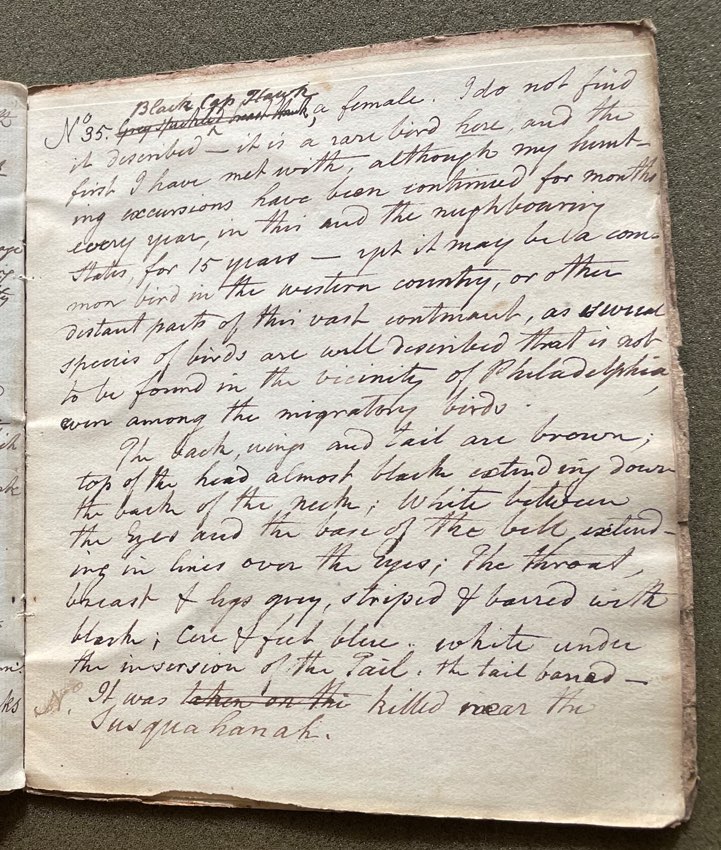 Charles Willson Peale (1741-1827) wrote, in his 13th Lecture (ca. 1799): "No. 35. Grey Speckled […] Hawk Black Cap Hawk, a female. I do not find it described—it is a rare bird here, and the first I have met with, although my hunting excursions have been continued for months every year, in this and the neighboring states, for 15 years. Yet it may be a common bird in the western country, or other distant parts of this vast continant, as several species of birds are well described that is not to be found in the vicinity of Philadelphia, even among the migratory birds. / The back, wings and tail are brown; top of the head almost black extending down the back of the neck; white between the eyes and the base of the [beak], extending in lines over the eyes; the throat, breast & legs grey, striped & barred with black; cere & feet blue; white under the inversion of the tail; the tail barred. It was taken on the killed near the Susquehanna [River]." (Academy of Natural Sciences of Drexel University Archives, coll. 40)