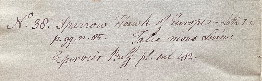 Charles Willson Peale (1741-1827) wrote, in his 13th Lecture (ca. 1799): "No. 32. Sparrow Hawk. This is of Europe. Cere green; feet yellow; plumage of blueish brown; belly of a dull white, barred with russet. Falco nisus Linn. Le [...] B[uffon]." He also listed "No. 38. Sparrow Hawk of Europe. Lath. I. i. p. 99. n. 85. Falco nisus Linn. l'espervier Buff. pl. enl. 412." (Academy of Natural Sciences of Drexel University Archives, coll. 40)