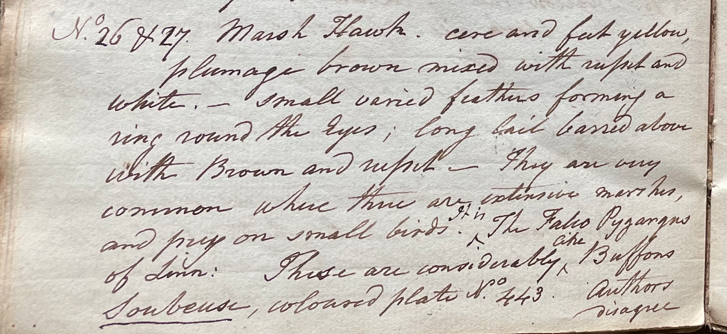 Peale wrote, in his 13th Lecture (ca. 1799): "No. 26 & 27. Marsh Hawk. Cere and feet yellow; plumage brown mixed with russet and white; small varied feathers forming a ring round the eyes; long tail barred above with brown and russet. They are very common where there are extensive marshes, and prey on small birds. It is the Falco pygargus of Linn. These are considerably like Buffon's Soubeuse, coloured plate No. 443. Authors disagree respecting the male and female of this bird, and whether these [specimens] are of a different sex, I cannot say, or whether it is a variety of this American Bird." (Academy of Natural Sciences of Drexel University Archives, coll. 40)