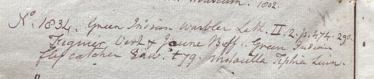 Charles Willson Peale (1741-1827) wrote, in his 36th Lecture (ca. 1799): "No. 1834. Green Indian Warbler. Lath. II. 2. p. 474. 290. Figuier Vert & Jaune Buff. Green Indian Flycatcher Edws. t. 79. Motacilla tiphia. Linn." (Academy of Natural Sciences of Drexel University Archives, coll. 40)