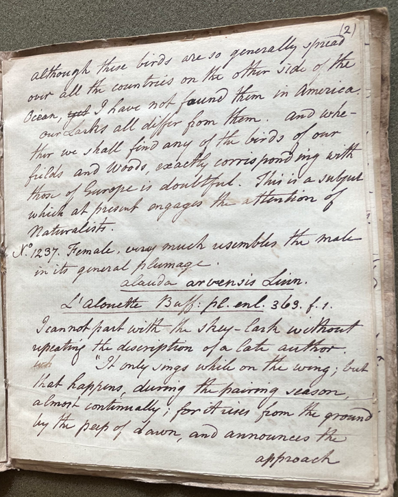Peale also described a female: "No. 1237. Female, very much resembles the male in its general plumage … I cannot part with the Sky-lark without repeating the description of a late author: 'It only sings while on the wing; but that happens during the pairing season, almost continually; for it rises from the ground by the peep of dawn, and announces the approach of day to the whole of animated nature. When it first leaves the earth, its notes are feeble and interrupted. As it rises, however, they gradually swell to their fill tone; and the brid, long after it has soard to a height where it is lost to the eye, still continues to charm the ear with its melodious lays. There is something in the concomitant scenery, which renders the music of the lark more delightful than that of any other bird. The pleasing landscape, the silence of all nature, as if listening to its early call, the rising sun, and the gilded sky, all contribute to heighten our relish for its innocent lays, and increase our attachment to this favorite'." (ANSP Archives, coll. 40)