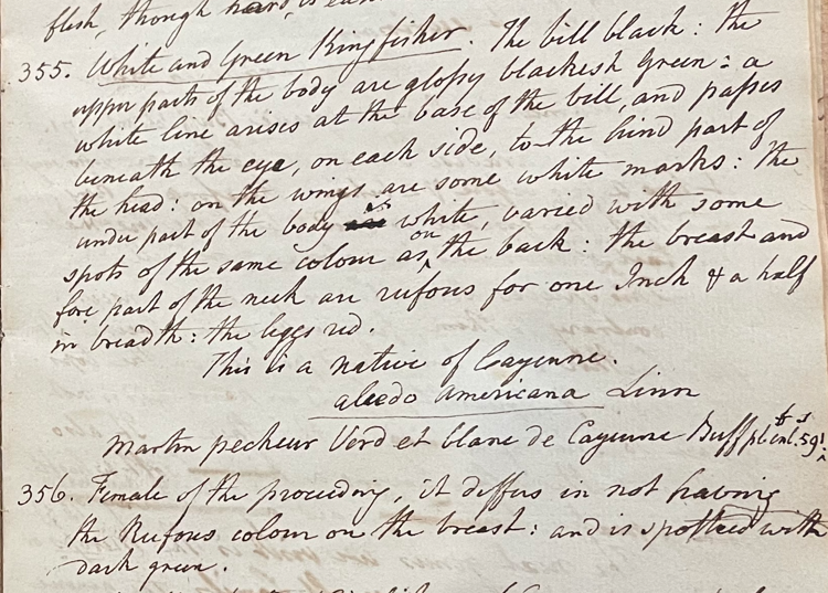 Charles Willson Peale (1741-1827) wrote, in his 19th Lecture (ca. 1799): "355. White and Green Kingfisher. The bill black; the upper parts of the body are glossy blackish green; a white line arises at the base of the bill, and passes beneath the eye, on each side, to the hind part of the head; on the wings are some white marks; the under part of the body is white; varied with some spots of the same colour as on the back; the breast and fore part of the neck are rufous for one Inch & a half in breadth; the legs red. This is a native of Cayenne. Alcedo americana Linn. Martin pecheur Verd et blanc de Cayenne Buff. pl. enl. 591. 356. Female of the preceeding; it differs in not having the Rufous colour on the breast; and is spotted with dark green." (Academy of Natural Sciences of Drexel University Archives, coll. 40)