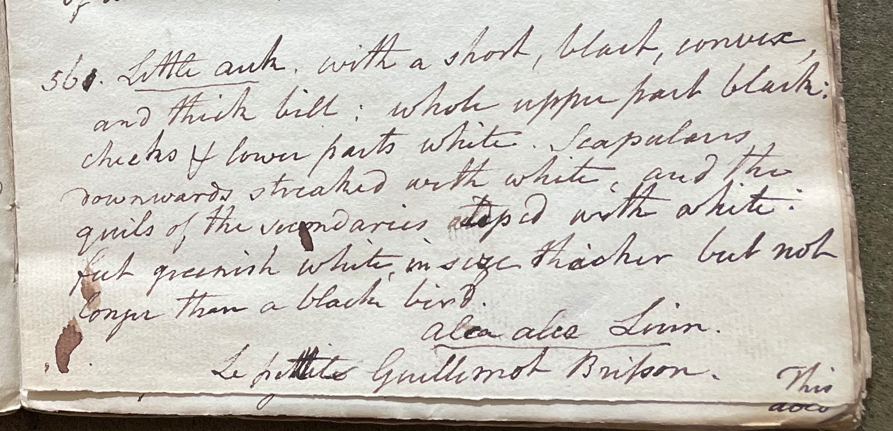 Charles Willson Peale (1741-1827) wrote, in his 23rd Lecture (ca. 1799): "561. Little Auk. with a short, black, convex and thick bill; whole upper part black; cheeks & lower parts white; scapulars downwards streaked with white, and the quills of the secondaries [striped] with white; feet greenish white, in size thicker but not longer than a black bird. Alca alle Linn. Le Petit Guillemot Brisson. This is the body, preserved to shew how much it is capable of being extended, or puffed up in a bellows form—which however all birds have a little but none that I have observed so striking, from which circumstance, probably they have got the name of Puffin." (Academy of Natural Sciences of Drexel University Archives, coll. 40)