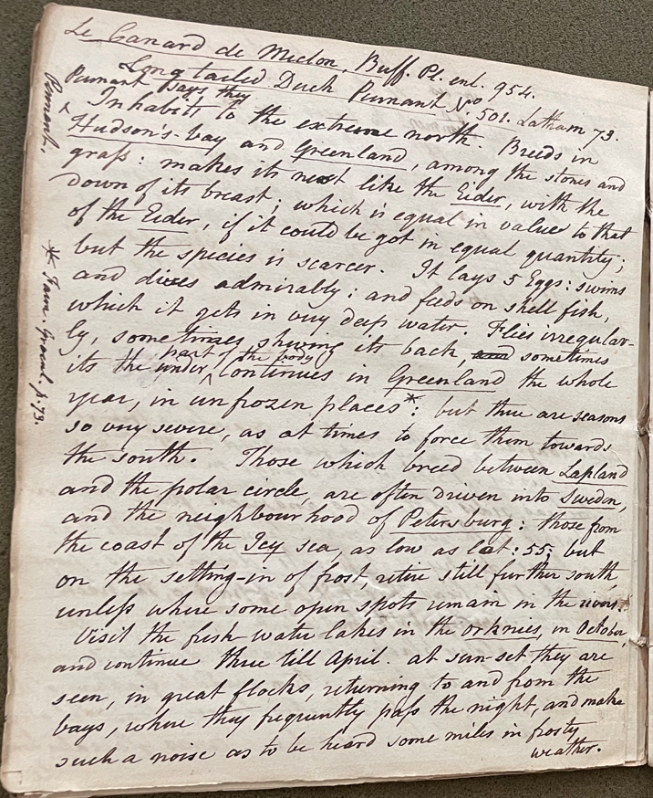 Peale continued: "Pennant says they inhabit to the extreme north. Breeds in Hudson's Bay and Greenland, among the stones and grass; makes its nest like the Eider, with the down of its breast; which is equal in value to that of the Eider, if it could be got in equal quantity; but the species is scarcer. It lays 5 Eggs; swims and dives admirably; and feeds on shell fish, which it gets in very deep water. Flies irregularly, sometimes showing its back, sometimes its the under part of the body. Continues in Greenland the whole year, in unfrozen places [a footnote inserted by Peale gives his source as "Faun. Greenl. p. 73"]; but there are seasons so very severe, as at times to force them towards the south. Those which breed between Lapland and the polar circle, are often driven into Sweden, and the neighbourhood of Petersburg; those from the coast of the Icy sea, as low as lat. 55; but on the setting-in of frost, retire still further south, unless where some open spots remain in the […]. Visit the fresh water lakes in the Orknies in October, and continue there till April." (ANSP Archives, coll. 40)