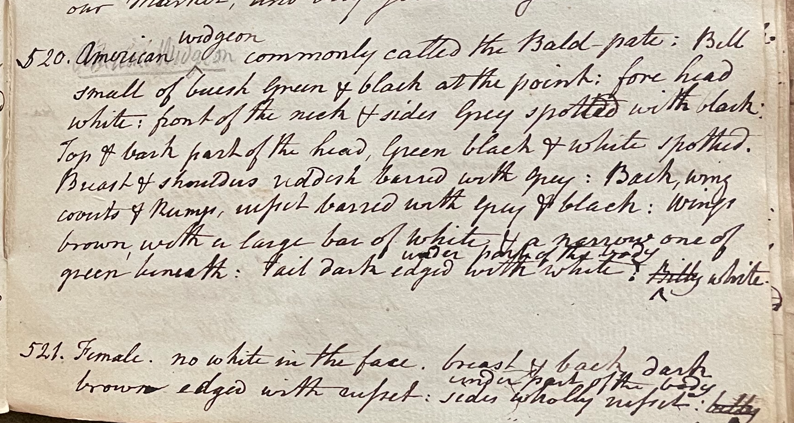 Peale wrote, in "A Walk Through the Philad[elphi]a Museum" (1805–1806): "The … common wigeon (a. Penelope) came from Sweden, they differ from the … American Wigeon called the bald pate." (Historical Society of Pennsylvania, coll. 0481)