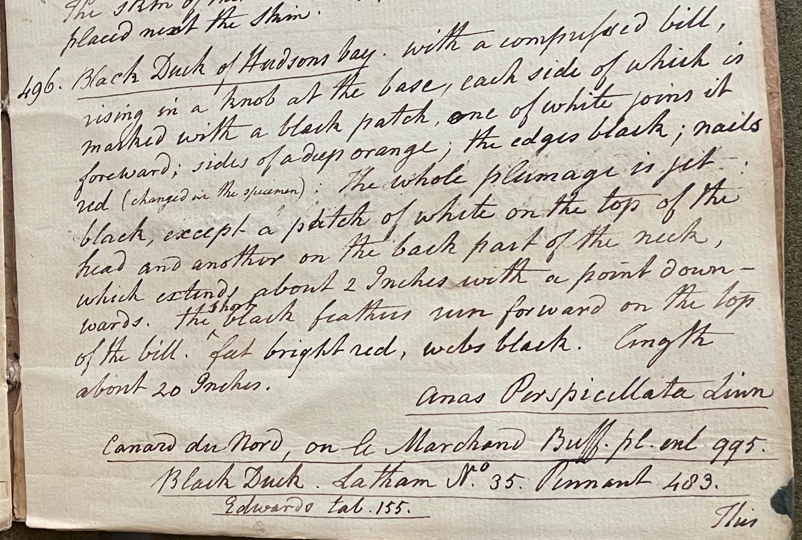 Charles Willson Peale (1741-1827) wrote, in his 21st Lecture (ca. 1799): "496. Black Duck of Hudsons Bay. with a compressed bill, rising in a knob at the base, each side of which is marked with a black patch, one of white joins it forwards; sides of a deep orange; the edges black; nails red (changed in the specimen); the whole plumage is jet black, except a patch of white on the top of the head and another on the back part of the neck, which extends about 2 Inches with a point downwards. The short black feathers run forward on the top of the bill; feet bright red, webs black. length about 20 Inches. Anas Perspicullata Linn. Canard du Nord, ou le Marchand Buff. pl. enl. 995. Black Duck. Latham No. 35. Pennant 483. Edwards tab. 155." (Academy of Natural Sciences of Drexel University Archives, coll. 40)