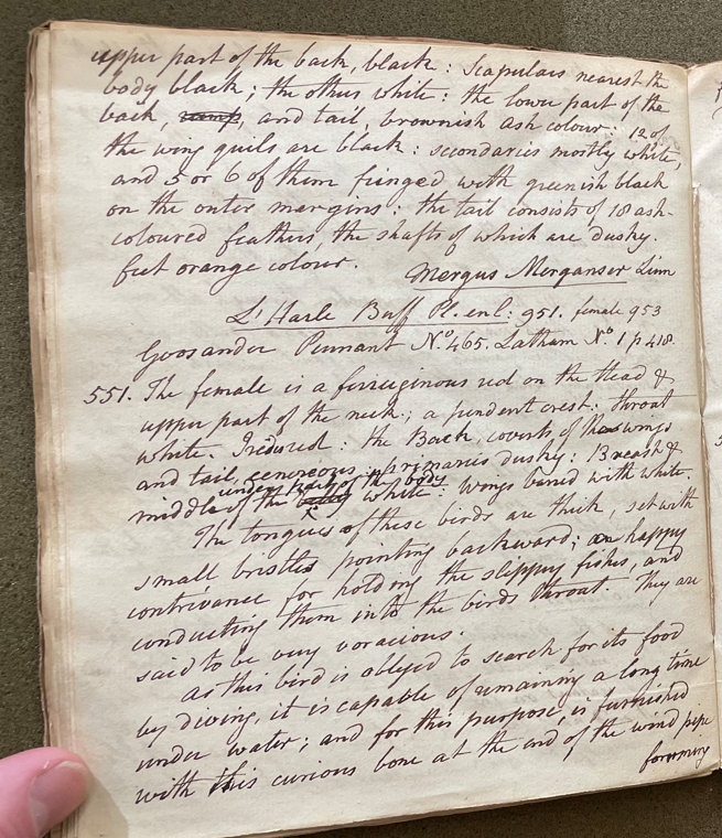 Charles Willson Peale (1741-1827) wrote, in his 22nd Lecture (ca. 1799): "550. Goosander. Bill red. 3 Inches long, toothed on both edges of the mandibles; tip of the upper much bent, and of the under a little swelling; Irides red; head is full of feathers on the top and back part; colour of that and half the neck, a fine glossy greenish black, the rest of the neck and under parts white; the upper part of the back, black; scapulars nearest the body black; the others white; the lower part of the back, and tail, brownish ash colour; 12 of the wing quils are black; secondaries mostly white, and 5 or 6 of them fringed with greenish black on the outer margins; the tail consists of 18 ash-coloured feathers, the shafts of which are dusky; feet orange colour. Mergus merganser Linn. L'Harles Buff. pl. enl. 951. female 953. Goosander Pennant No. 465. Latham No. 1 p. 418." (Academy of Natural Sciences of Drexel University Archives, coll. 40)