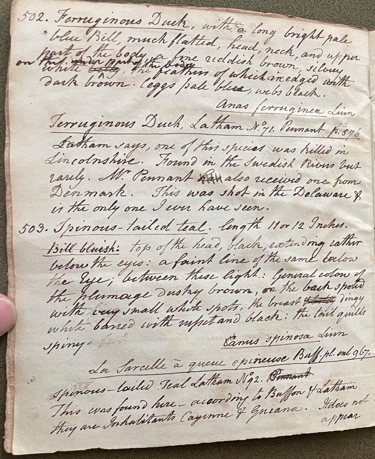 Immediately following that account, he described an adult female under a different name: "503. Spinous-tailed teal. Length 11 or 12 Inches. Bill bluish: top of the heard, black, extending rather below the eyes: a faint line of the same below the eye; between these light: general colour of the plumage dusky brown, & the back spotted with very small white spots, the breast dingy white barred with russet and black; the tail quills spiny. Anas spinosa Linn. La Sarcelle à queue épineuse [de Cayenne] Buff. pl. enl. 967. Spinous-tailed Teal Latham No. 92. Pennant This was found here [near Philadelphia]—according to Buffon & Latham, they are Inhabitants of Cayenne & Guiana. It does not appear to me unlike the be the female of the Ferruginous Duck No. 502." (ANSP Archives, coll. 40)