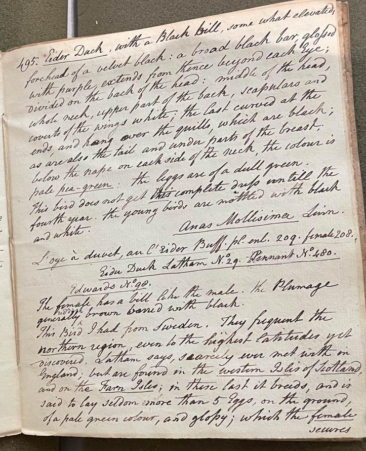Peale continued: "Latham also says, that this bird is found as far south as New York; and breeds on the desert Isles of new England; but most commonly every where to the north; are said to be constant to the same breeding-places, and that a pair has been observed to occupy the same nest for 20 years togather. Their food is shells, for which they dive to great [depths]. They take their young on their backs instantly to sea, then dive, to shake them off and teach them to shift for themselves. The Greenlanders kill them with darts; pursue them in their little boats what their course (when they dive by the air bubbles; and strile them when they rise wearied. The flesh is valued as a food. The skin of this bird is of great value as a garment placed next the Skin. [A footnote mentions the information was sourced from Pennant.]" (ANSP Archives, coll. 40) An undated scrap of paper tucked into Peale's 21st lecture manuscript contains a scribbled list of duck specimens, including: "Eider D. – its valuable down, &c." (ANSP Archives, coll. 40) Peale wrote, in "A Walk Through the Philad[elphi]a Museum" (1805–1806): "How valuable is the Eider Duck (a. Mollissima) their flesh are valued as a food, but its down is infinitely more valuable, it is said that 3 pounds (?) of this down may be compressed into a space scarce bigger than one's fist; yet is afterwards so dilatable as to fill a quilt five feet square. They frequent the highest latitude & breed in Iceland were the down is taken from their nests. They also are found as far south as New York" (Historical Society of Pennsylvania, coll. 0481). Alexander Wilson (1766-1813) described this species under the name "Eider Duck / Anas mollissima" in American Ornithology vol. 8, published posthumously (Pl. 71). He described the male and female in separate accounts, citing "Peale's Museum, No. 2706" (male) and "Peale's Museum, No. 2707" (female), respectively (Wilson 1814: 122, 125). / https://www.biodiversitylibrary.org/item/175758#page/144/mode/1up (male text) / https://www.biodiversitylibrary.org/item/175758#page/147/mode/1up (female text) / https://www.biodiversitylibrary.org/item/175758#page/141/mode/1up (plate)Notes:
