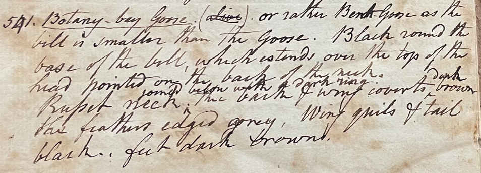 Charles Willson Peale (1741-1827) wrote, in his 21st Lecture (ca. 1799): "Botany-bay Goose. (alive). or rather Bent-Goose as the bill is smaller than the goose. Black round the base of the bill, which extends over the top of the head, pointed on the back of the neck. Dark russet neck […] below with a dark ring. The back & wing coverts dark brown; […] feathers edged grey. Wing quils & tail black. Feet dark brown." (Academy of Natural Sciences of Drexel University Archives, coll. 40)